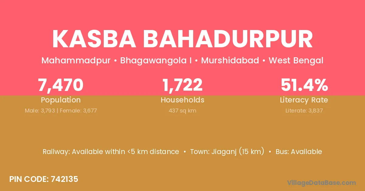 Jiaganj (15 km) is the nearest town to Kasba Bahadurpur village for major economic activities and is located approximately 15 km away.