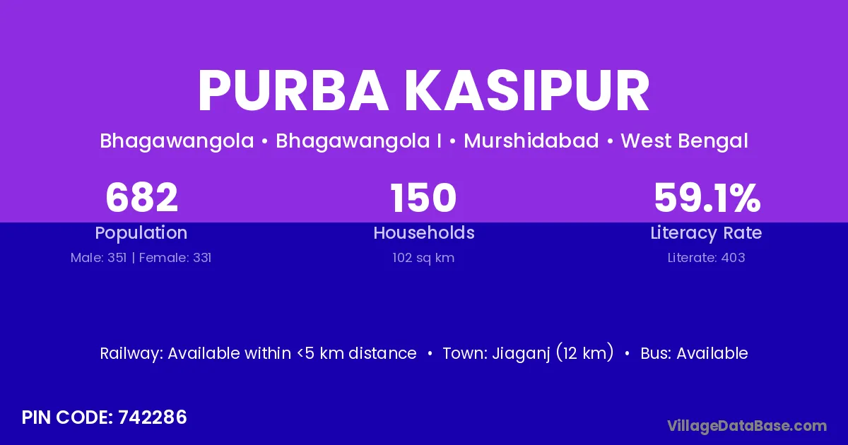Jiaganj (12 km) is the nearest town to Purba Kasipur village for major economic activities and is located approximately 12 km away.