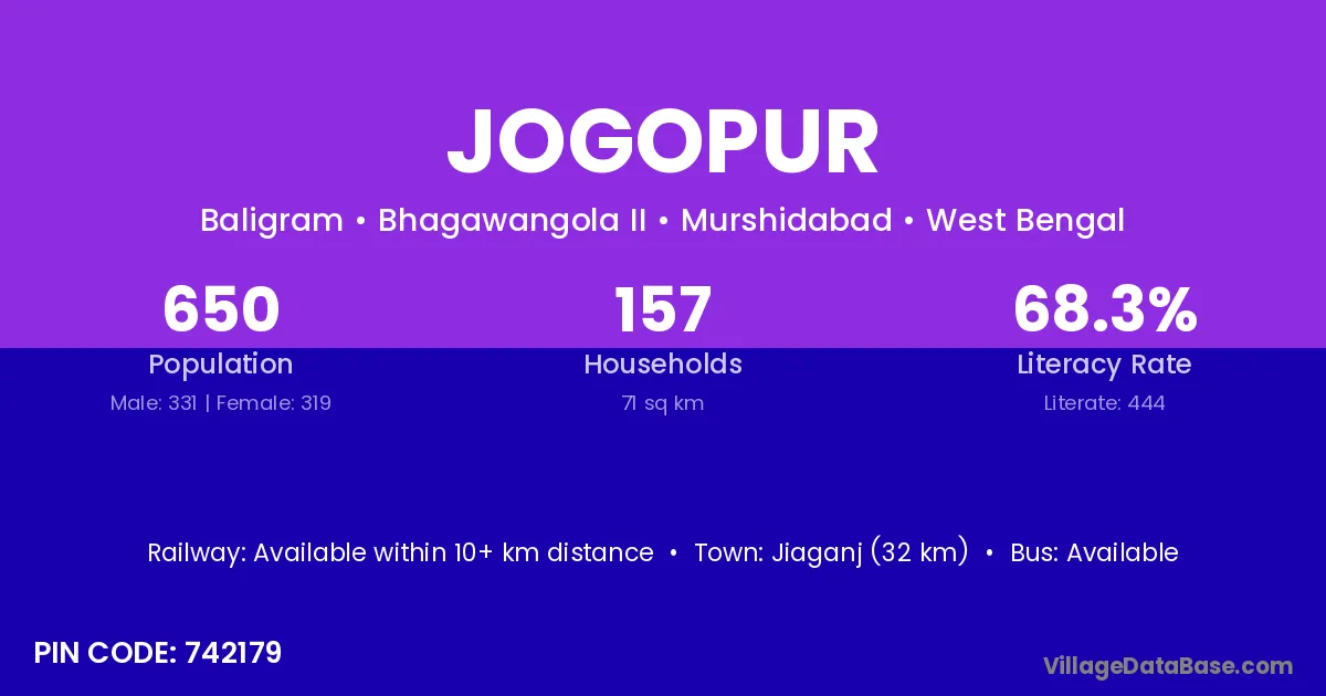 Jogopur village is located in the Bhagawangola II Subdivision of the Murshidabad district in West Bengal.