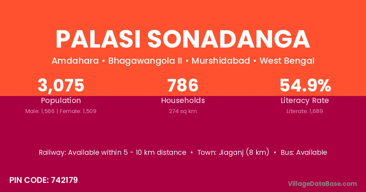 Jiaganj (8 km) is the nearest town to Palasi Sonadanga village for major economic activities and is located approximately 8 km away.