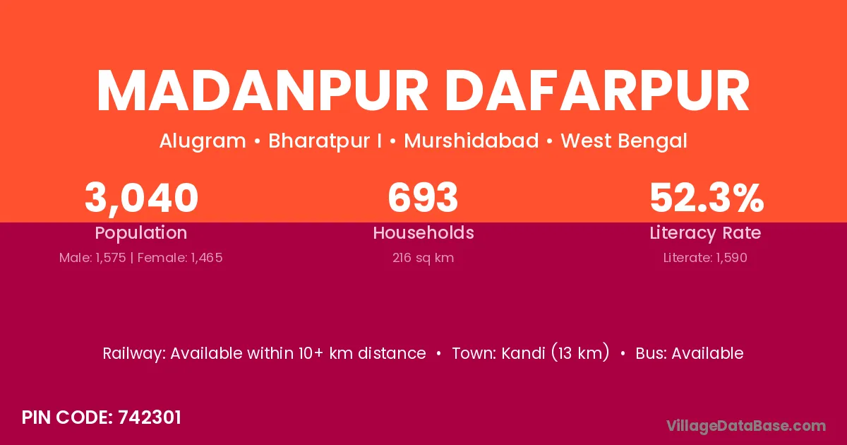 Kandi (13 km) is the nearest town to Madanpur Dafarpur village for major economic activities and is located approximately 13 km away.