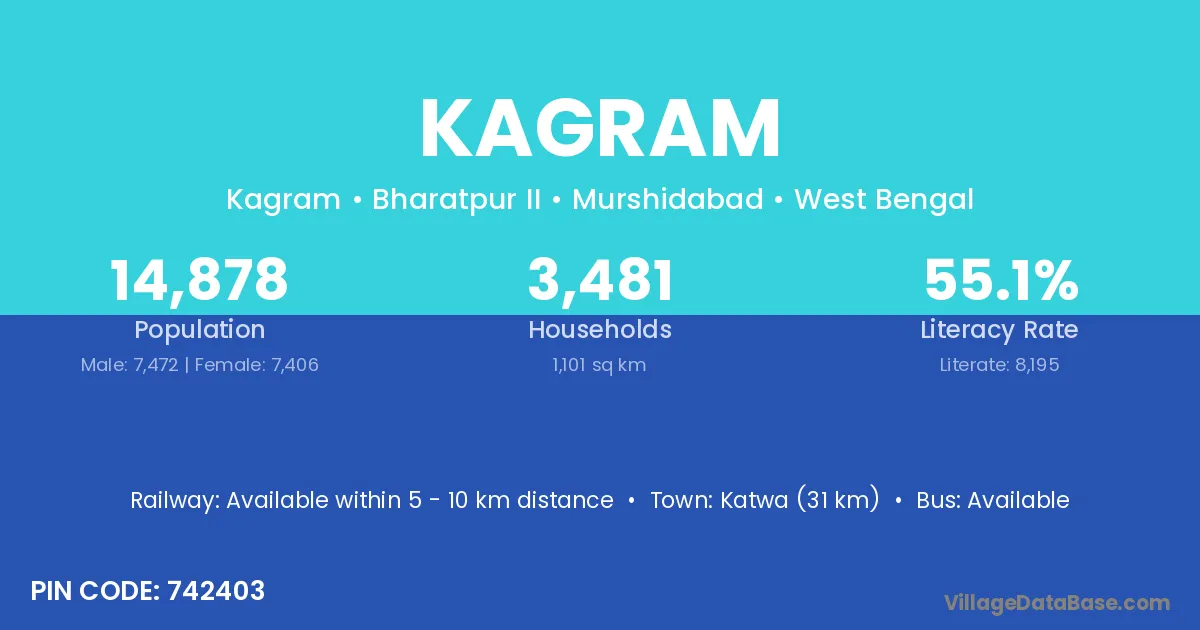 Katwa (31 km) is the nearest town to Kagram village for major economic activities and is located approximately 31 km away.