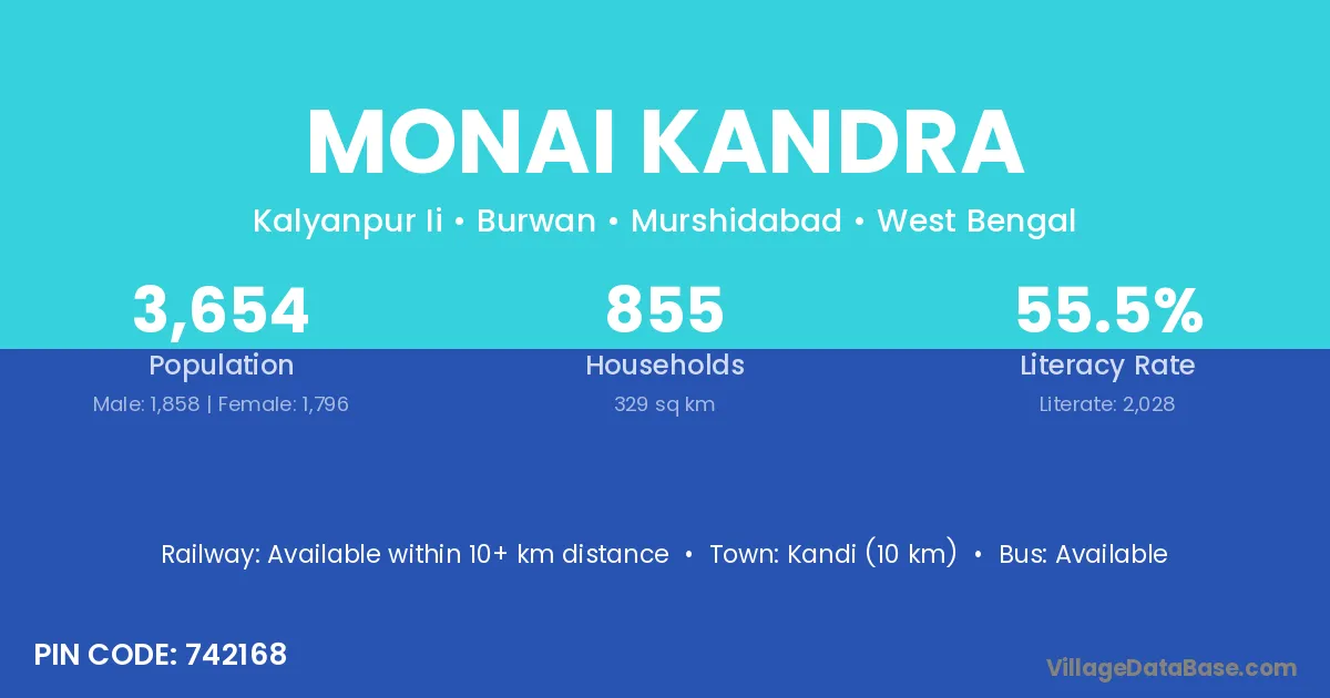 Kandi (10 km) is the nearest town to Monai Kandra village for major economic activities and is located approximately 10 km away.