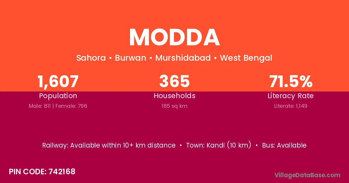 Kandi (10 km) is the nearest town to Modda village for major economic activities and is located approximately 10 km away.