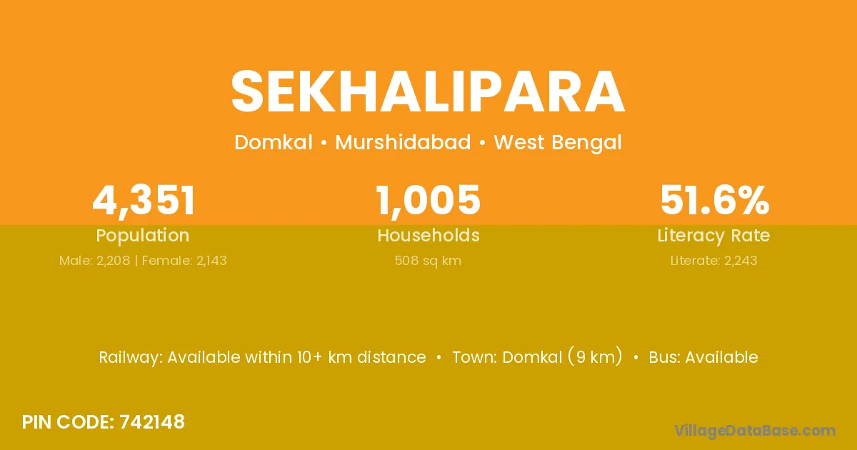 Sekhalipara village has a total population of 4,351 people, of which 2,208 are males and 2,143 are females.