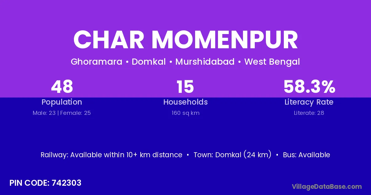 Domkal (24 km) is the nearest town to Char Momenpur village for major economic activities and is located approximately 24 km away.