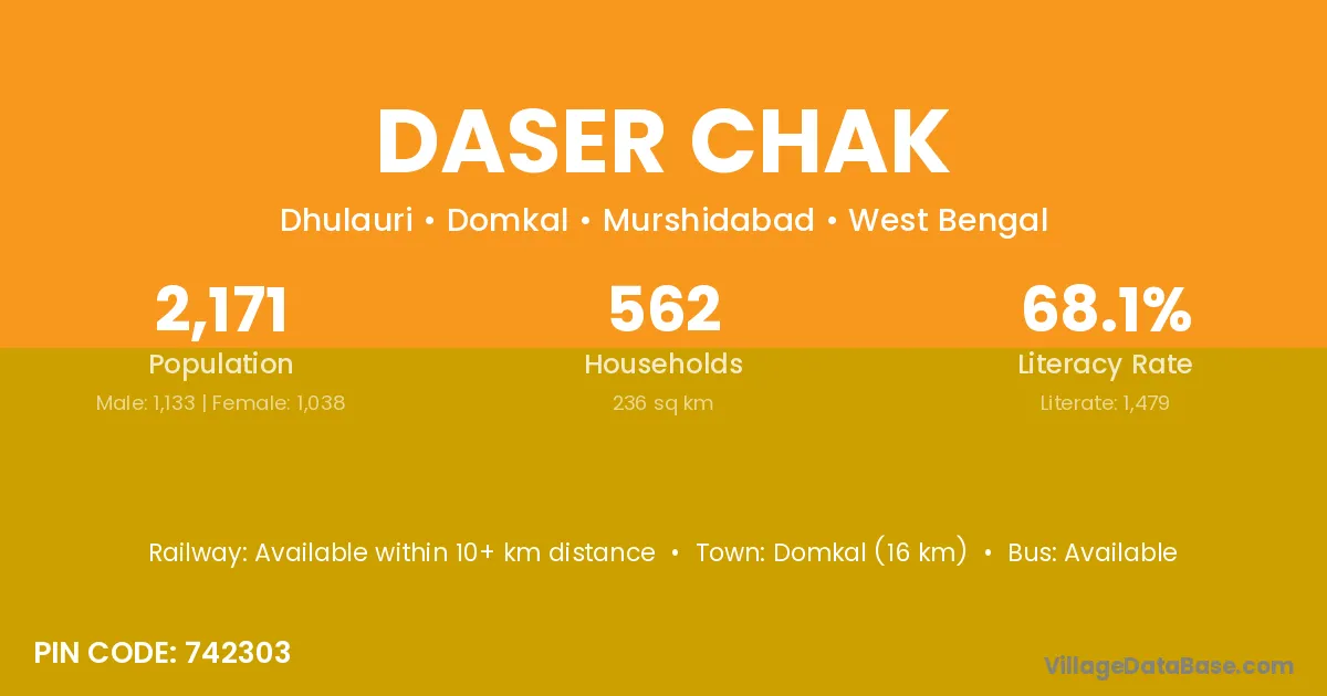 Domkal (16 km) is the nearest town to Daser Chak village for major economic activities and is located approximately 16 km away.