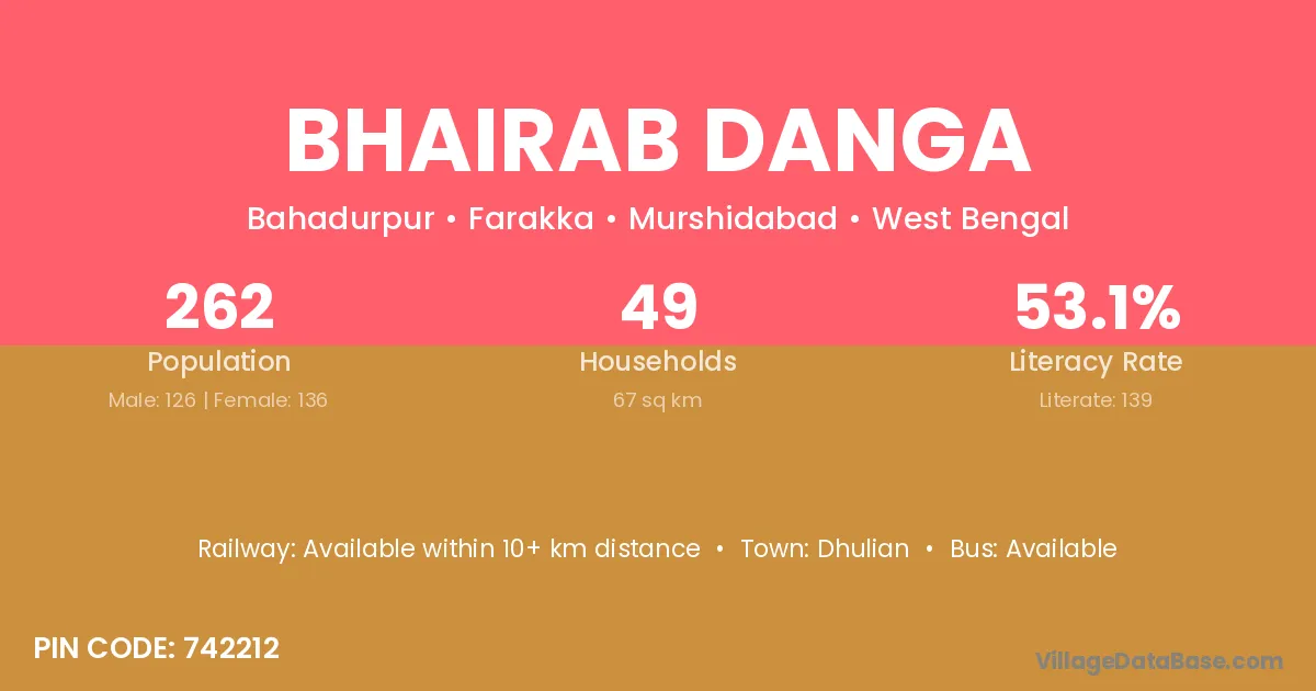 Bhairab Danga village has a total population of 262 people, of which 126 are males and 136 are females.