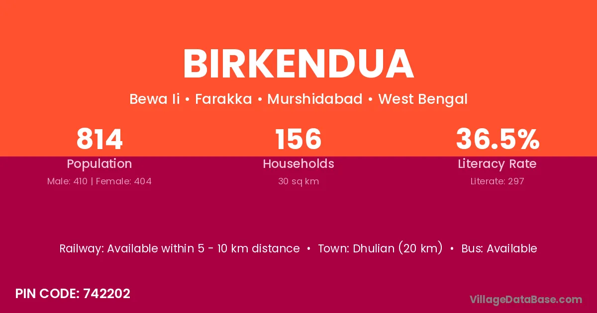 Dhulian (20 km) is the nearest town to Birkendua village for major economic activities and is located approximately 20 km away.
