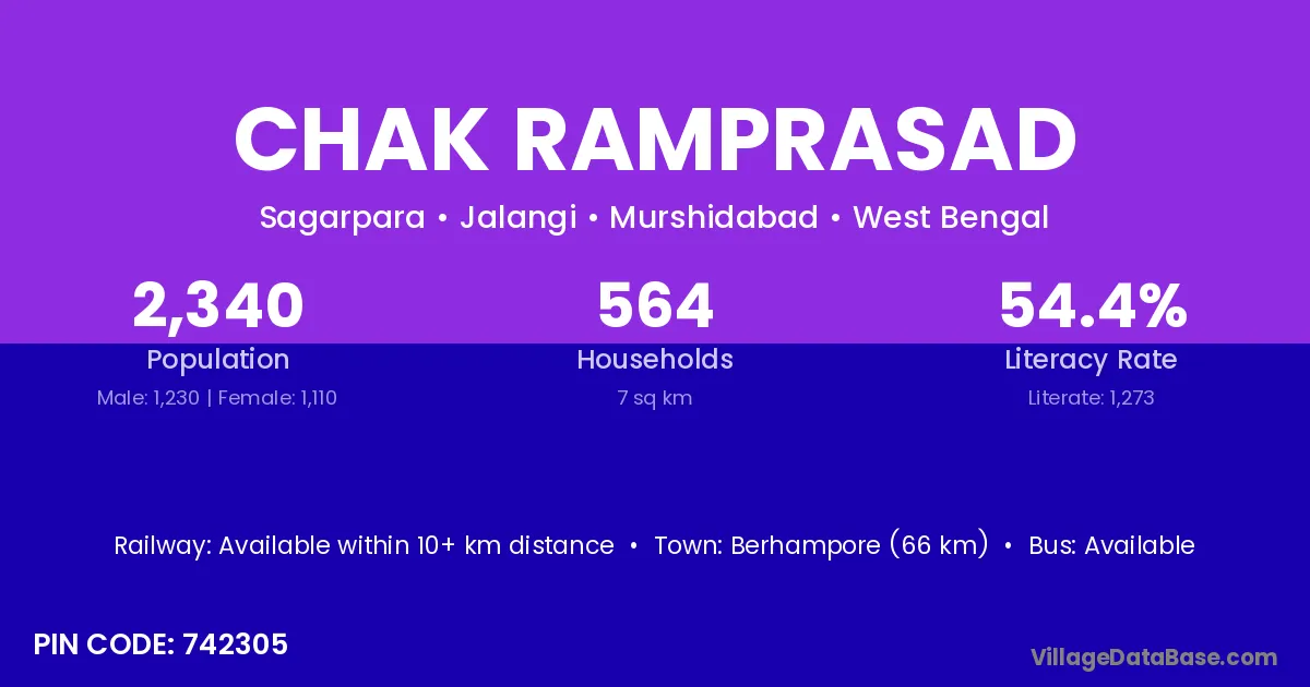 Berhampore (66 km) is the nearest town to Chak Ramprasad village for major economic activities and is located approximately 66 km away.