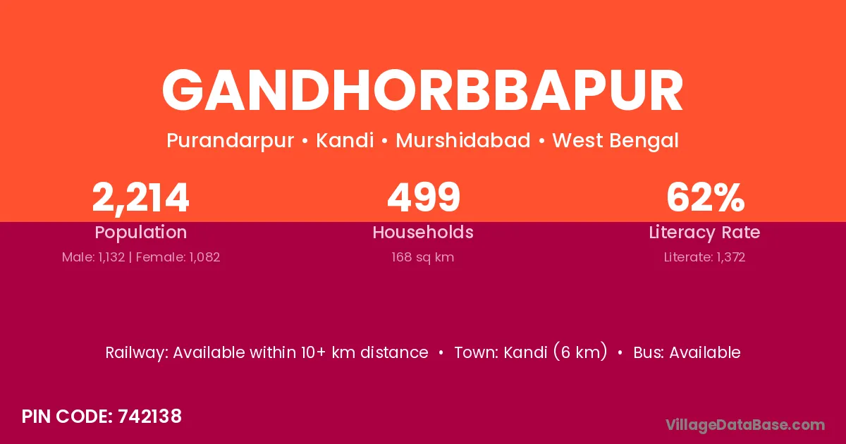 Kandi (6 km) is the nearest town to Gandhorbbapur village for major economic activities and is located approximately 6 km away.
