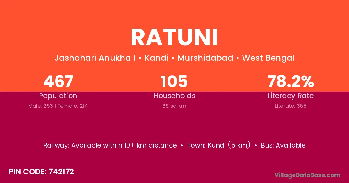 Ratuni village has a total population of 467 people, of which 253 are males and 214 are females.