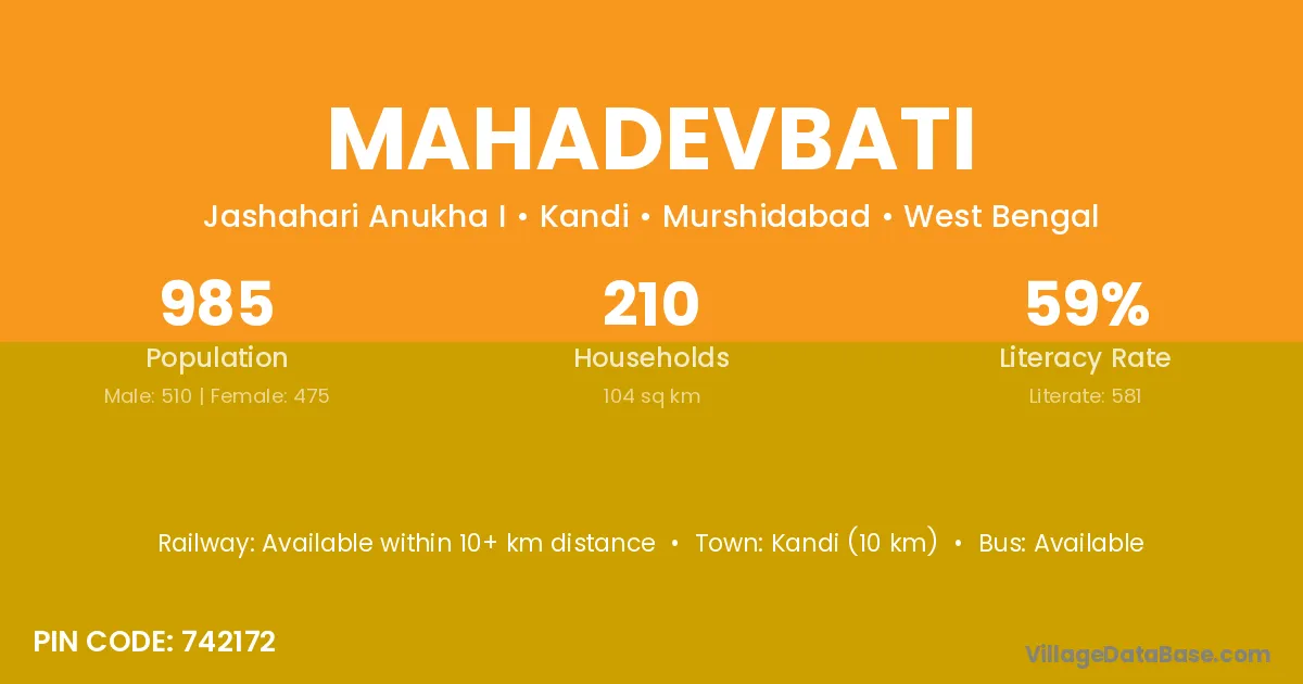 Kandi (10 km) is the nearest town to Mahadevbati village for major economic activities and is located approximately 10 km away.