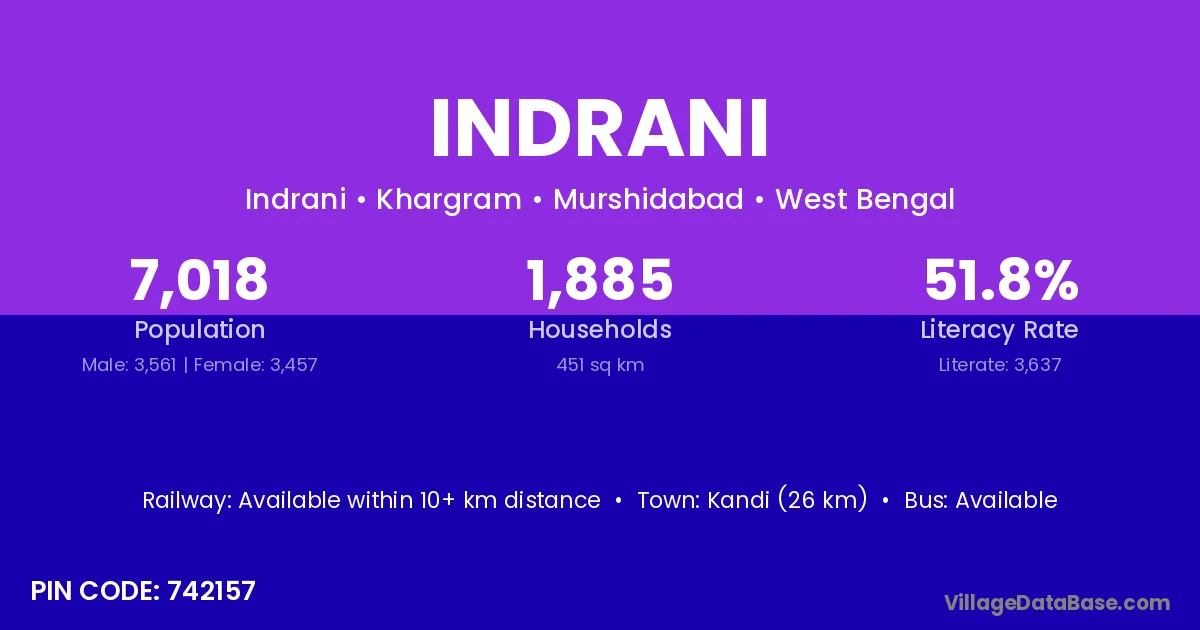 Kandi (26 km) is the nearest town to Indrani village for major economic activities and is located approximately 26 km away.