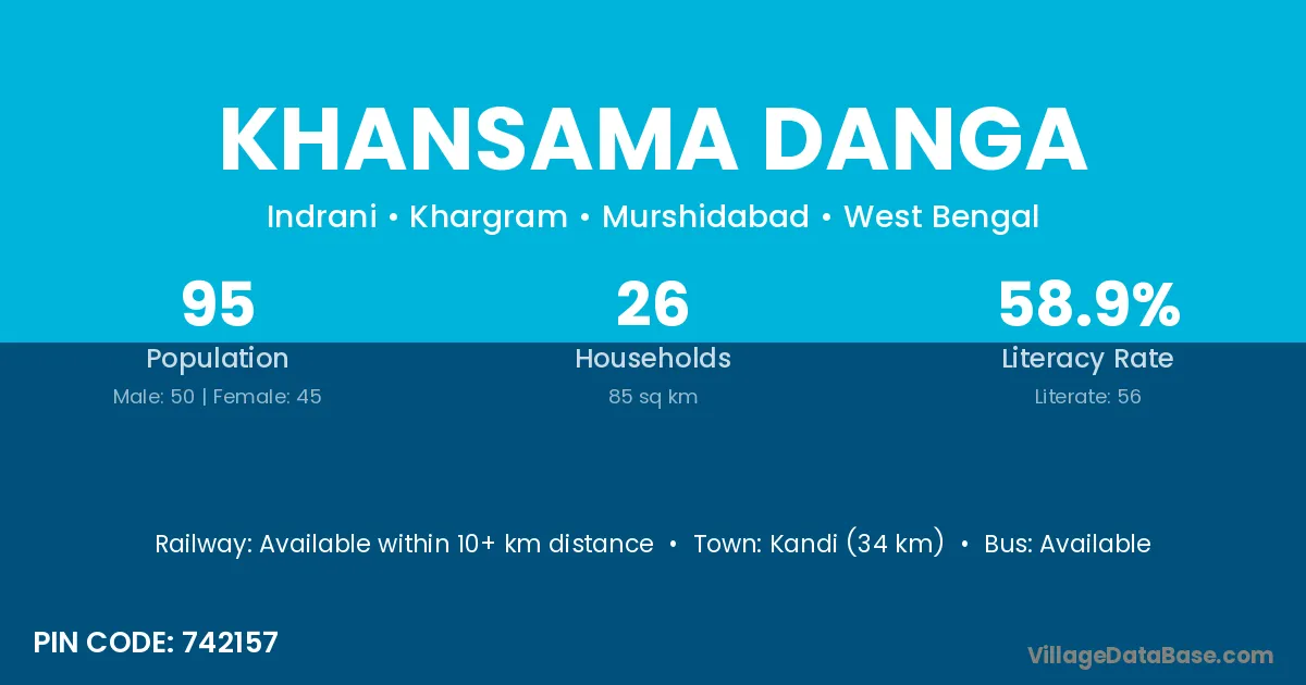 Kandi (34 km) is the nearest town to Khansama Danga village for major economic activities and is located approximately 34 km away.