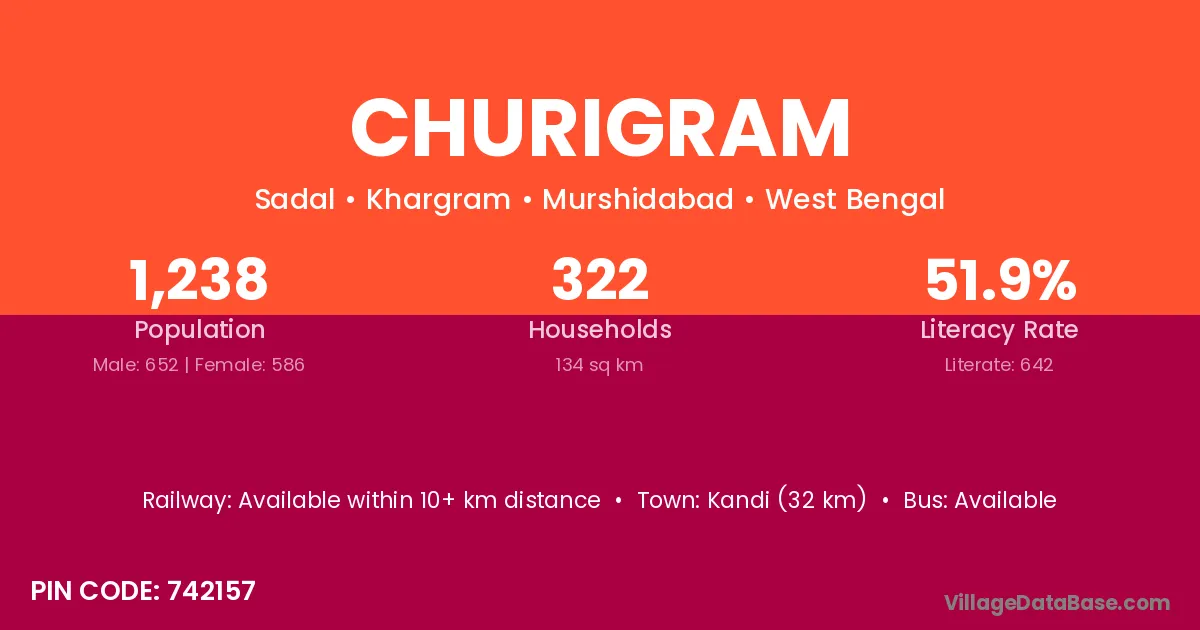 Kandi (32 km) is the nearest town to Churigram village for major economic activities and is located approximately 32 km away.