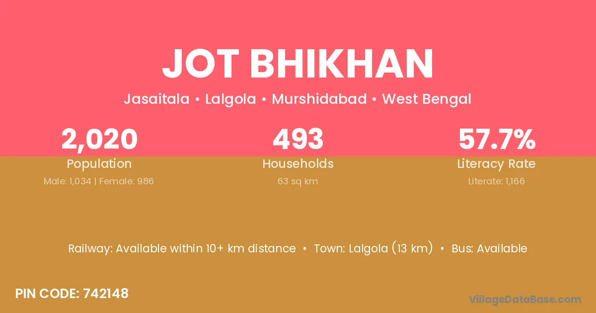 Lalgola (13 km) is the nearest town to Jot Bhikhan village for major economic activities and is located approximately 13 km away.