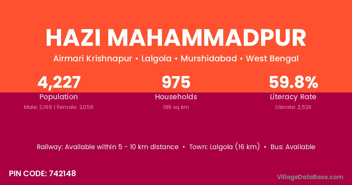 Lalgola (16 km) is the nearest town to Hazi Mahammadpur village for major economic activities and is located approximately 16 km away.