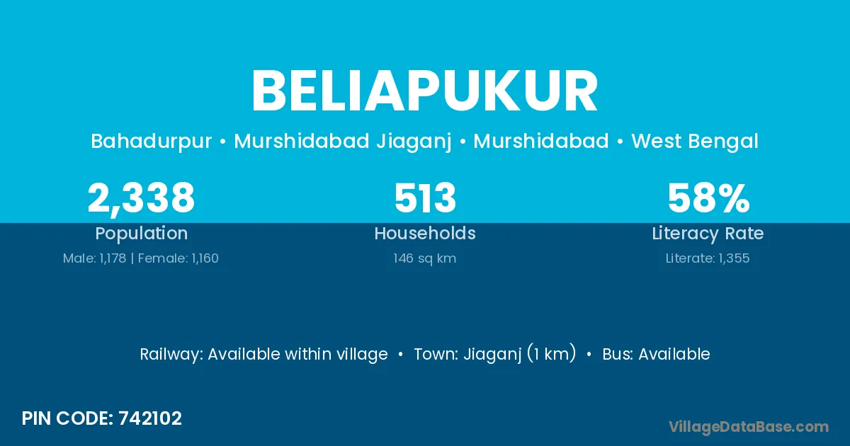 Jiaganj (1 km) is the nearest town to Beliapukur village for major economic activities and is located approximately 1 km away.