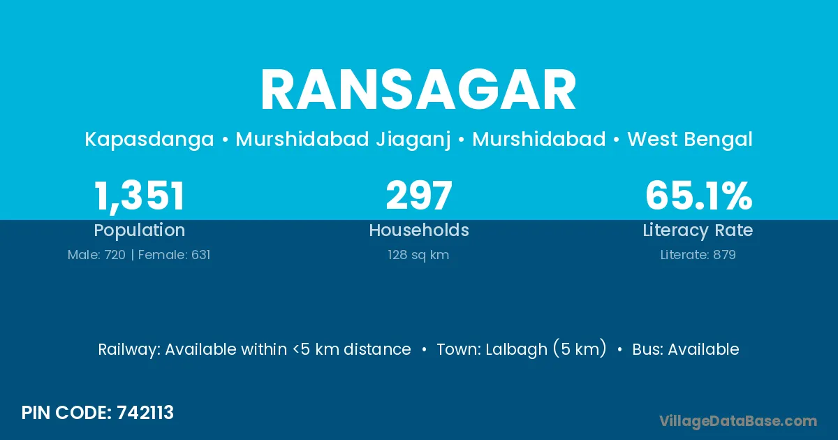 Lalbagh (5 km) is the nearest town to Ransagar village for major economic activities and is located approximately 5 km away.