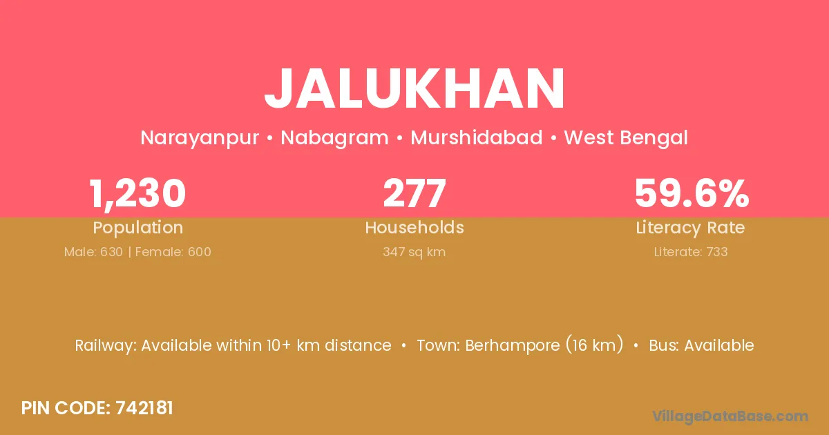 Berhampore (16 km) is the nearest town to Jalukhan village for major economic activities and is located approximately 16 km away.