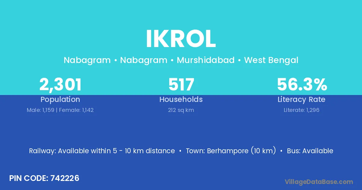Berhampore (10 km) is the nearest town to Ikrol village for major economic activities and is located approximately 10 km away.