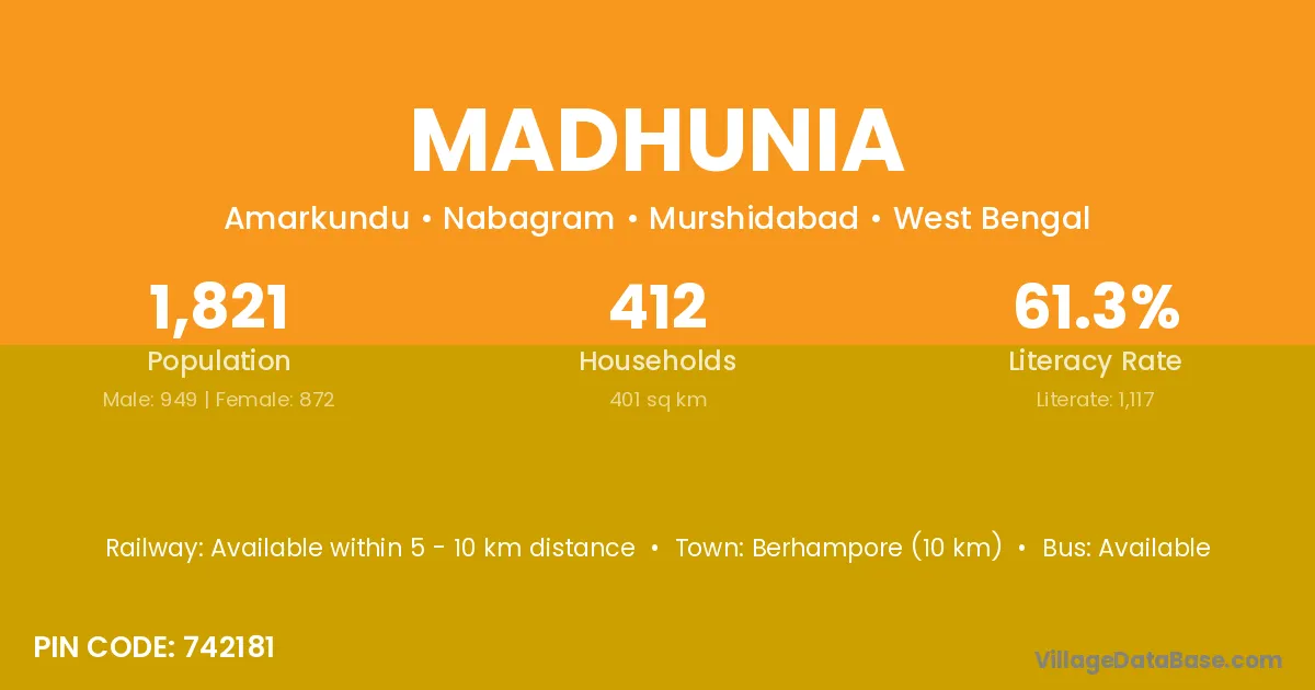 Berhampore (10 km) is the nearest town to Madhunia village for major economic activities and is located approximately 10 km away.