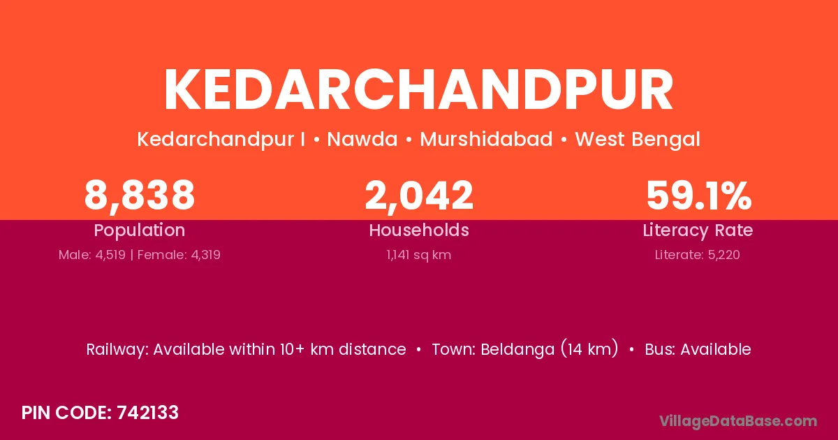 Beldanga (14 km) is the nearest town to Kedarchandpur village for major economic activities and is located approximately 14 km away.