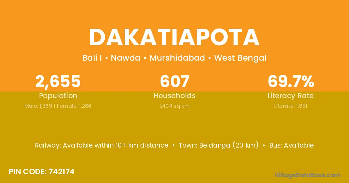 Beldanga (20 km) is the nearest town to Dakatiapota village for major economic activities and is located approximately 20 km away.