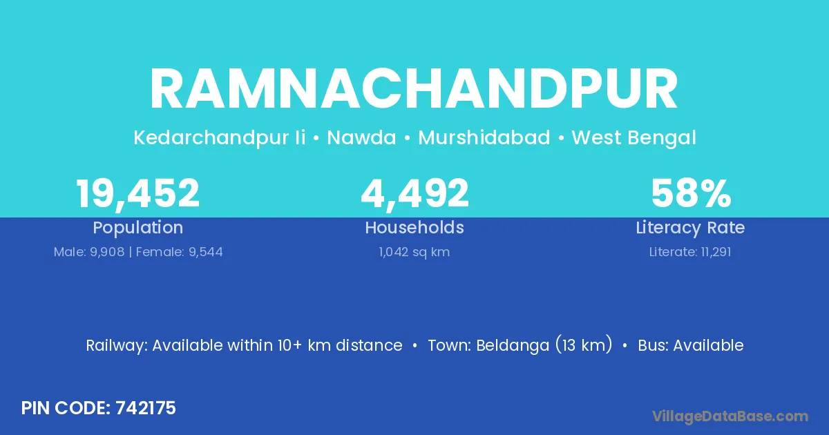 Beldanga (13 km) is the nearest town to Ramnachandpur village for major economic activities and is located approximately 13 km away.
