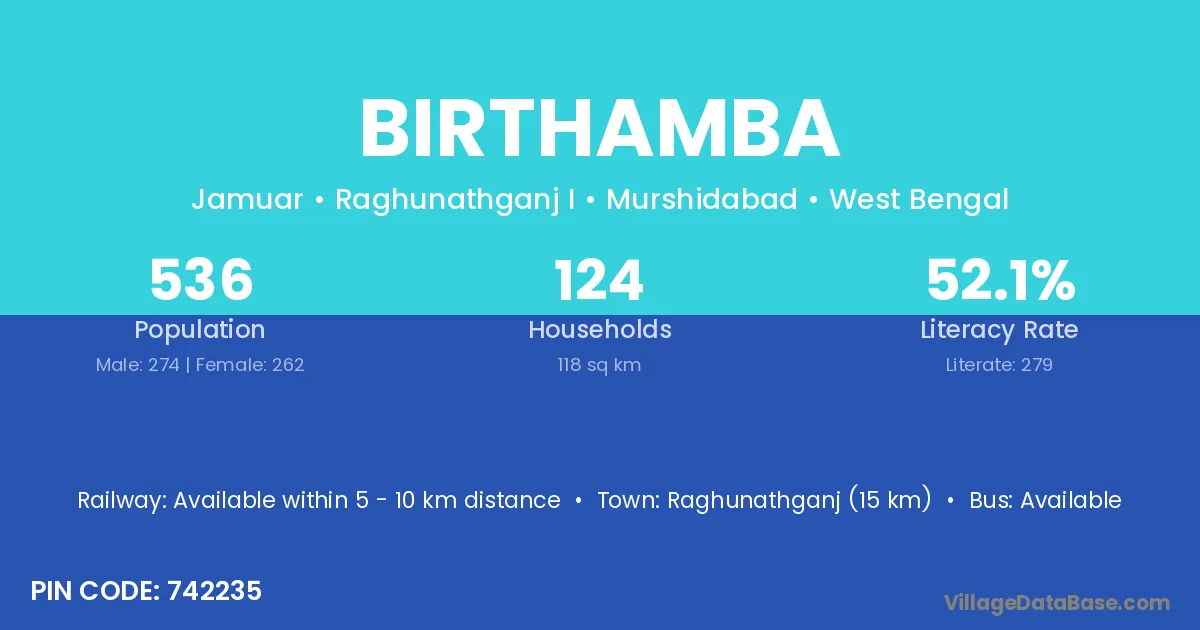 Raghunathganj (15 km) is the nearest town to Birthamba village for major economic activities and is located approximately 15 km away.