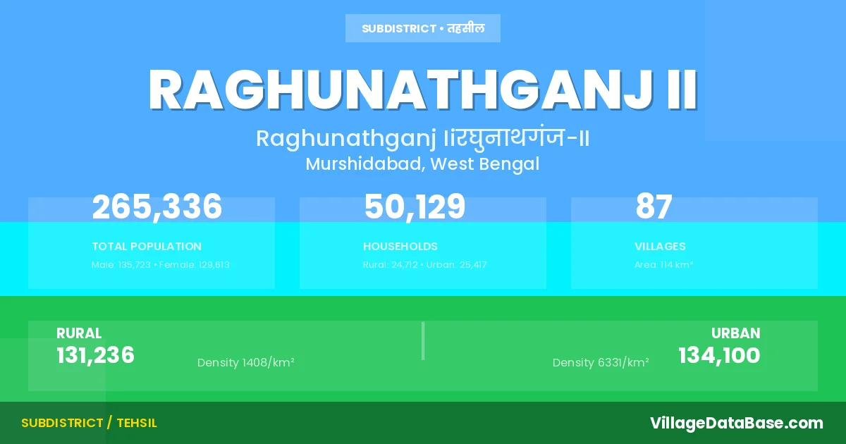 According to the 2011 census The total area of Raghunathganj II Subdivision is 114 km², with a population of 265336 people. The population density is 2,320 inhabitants per square kilometre, and there are approximately 50129 houses in the sub district.