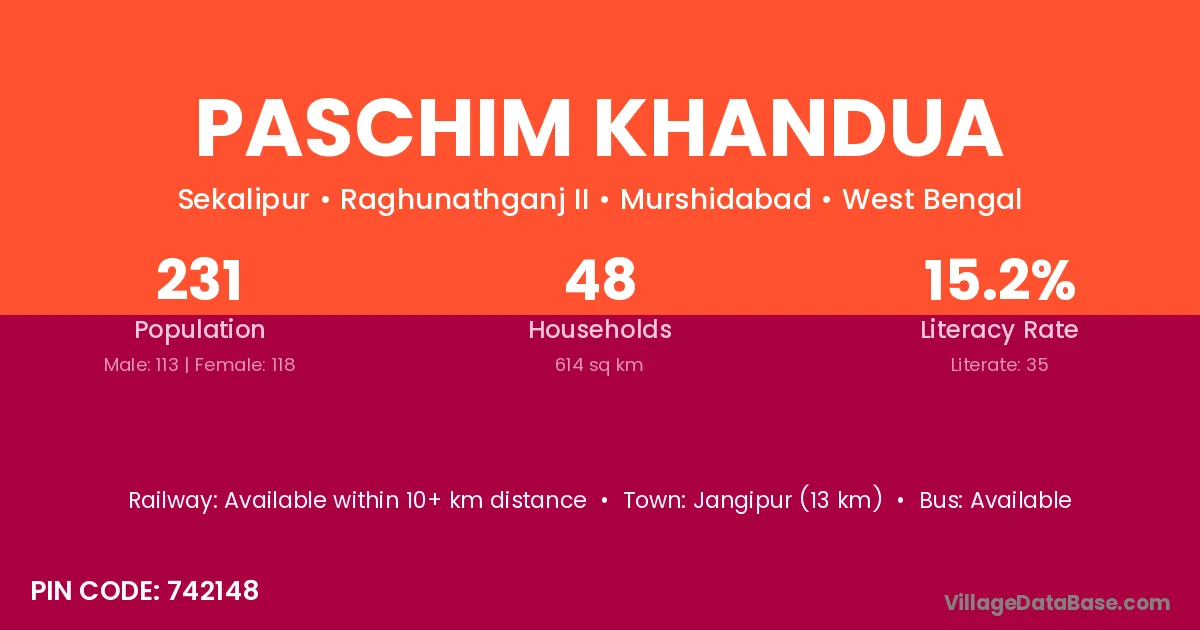 Jangipur (13 km) is the nearest town to Paschim Khandua village for major economic activities and is located approximately 13 km away.