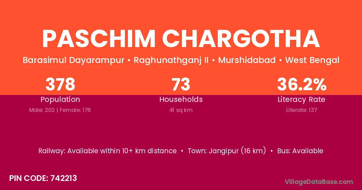 Jangipur (16 km) is the nearest town to Paschim Chargotha village for major economic activities and is located approximately 16 km away.