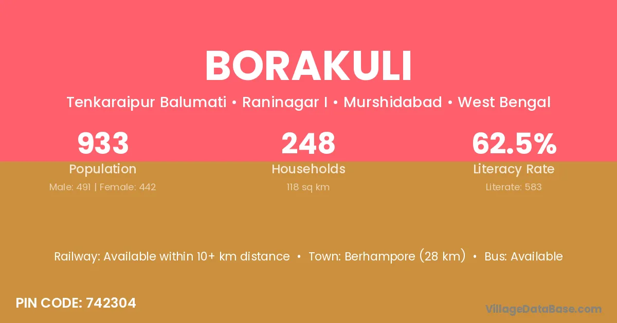 Berhampore (28 km) is the nearest town to Borakuli village for major economic activities and is located approximately 28 km away.