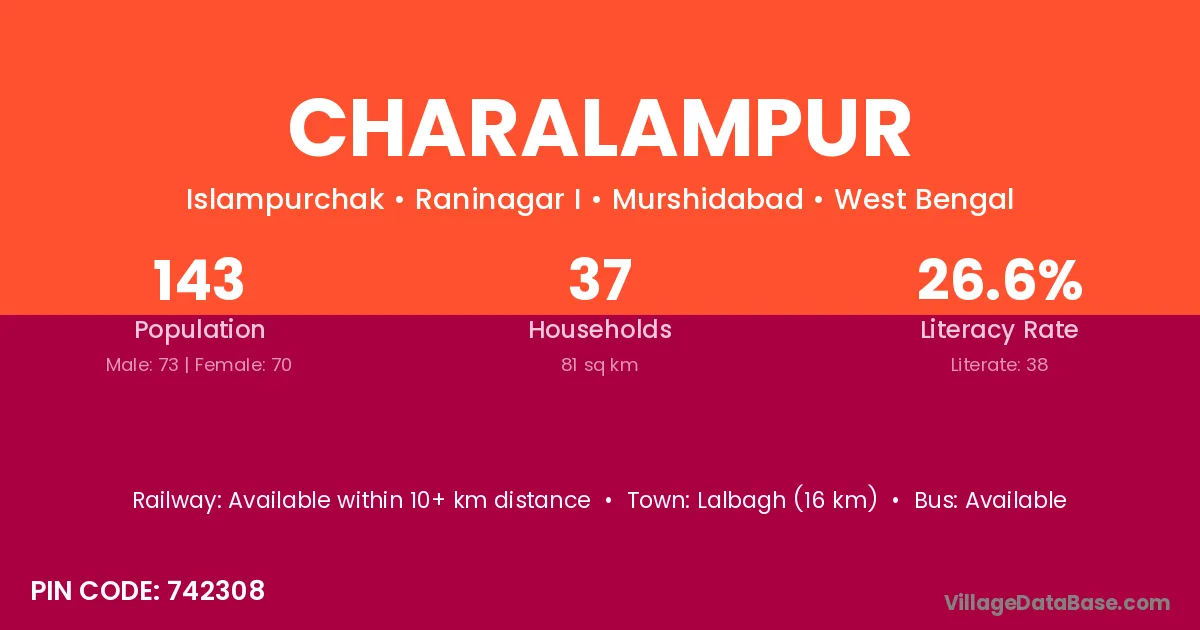 Lalbagh (16 km) is the nearest town to Charalampur village for major economic activities and is located approximately 16 km away.