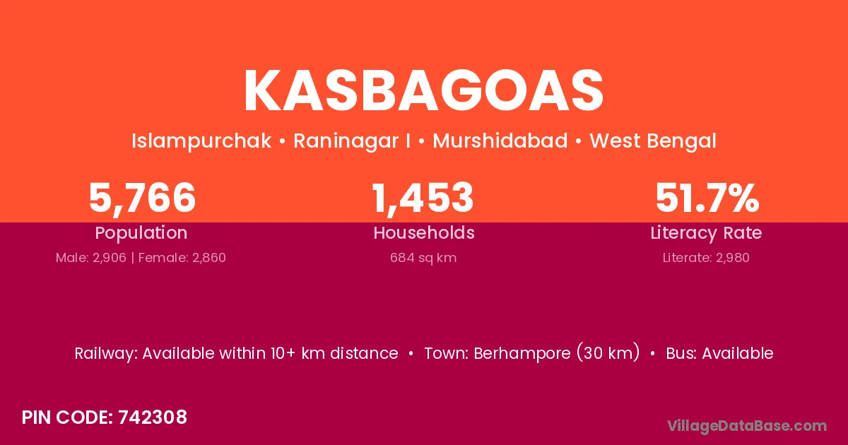 Berhampore (30 km) is the nearest town to Kasbagoas village for major economic activities and is located approximately 30 km away.