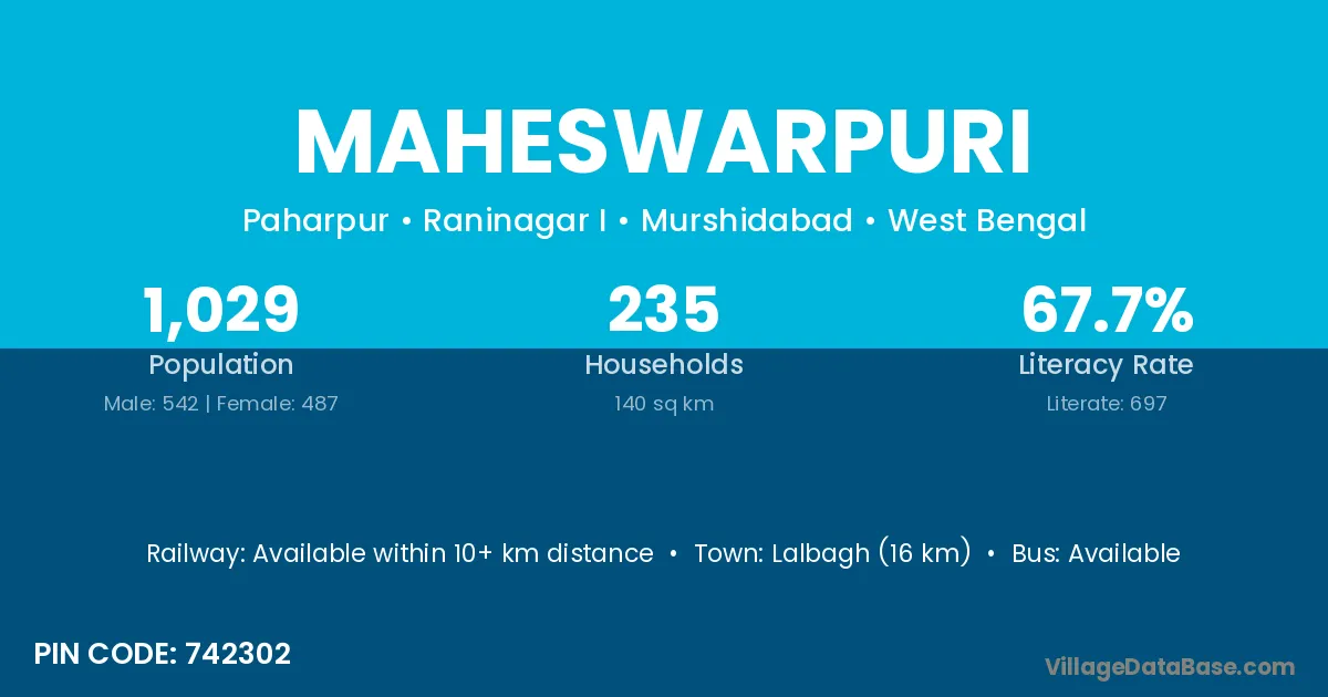 Lalbagh (16 km) is the nearest town to Maheswarpuri village for major economic activities and is located approximately 16 km away.