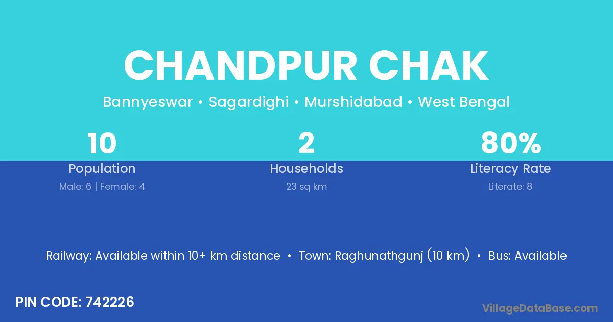 Raghunathgunj (10 km) is the nearest town to Chandpur Chak village for major economic activities and is located approximately 10 km away.