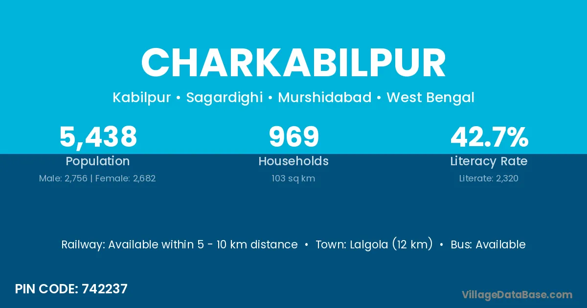 Lalgola (12 km) is the nearest town to Charkabilpur village for major economic activities and is located approximately 12 km away.