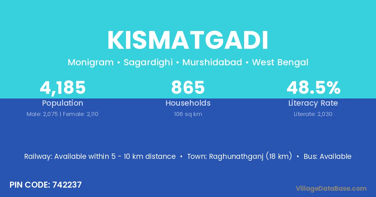 Raghunathganj (18 km) is the nearest town to Kismatgadi village for major economic activities and is located approximately 18 km away.
