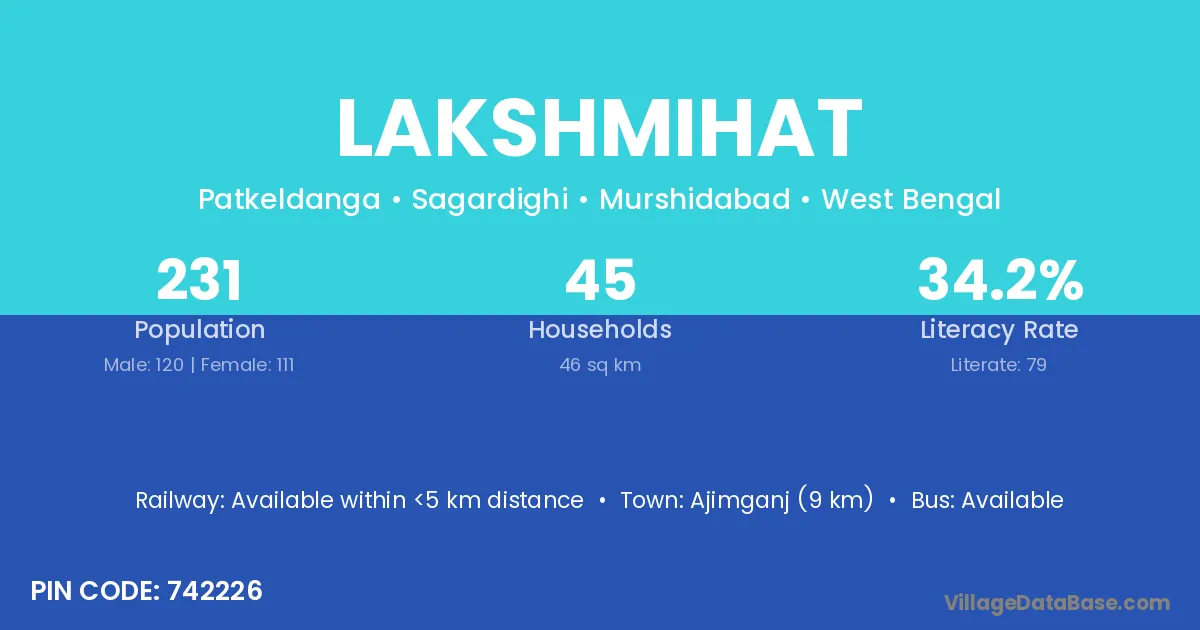 Ajimganj (9 km) is the nearest town to Lakshmihat village for major economic activities and is located approximately 9 km away.