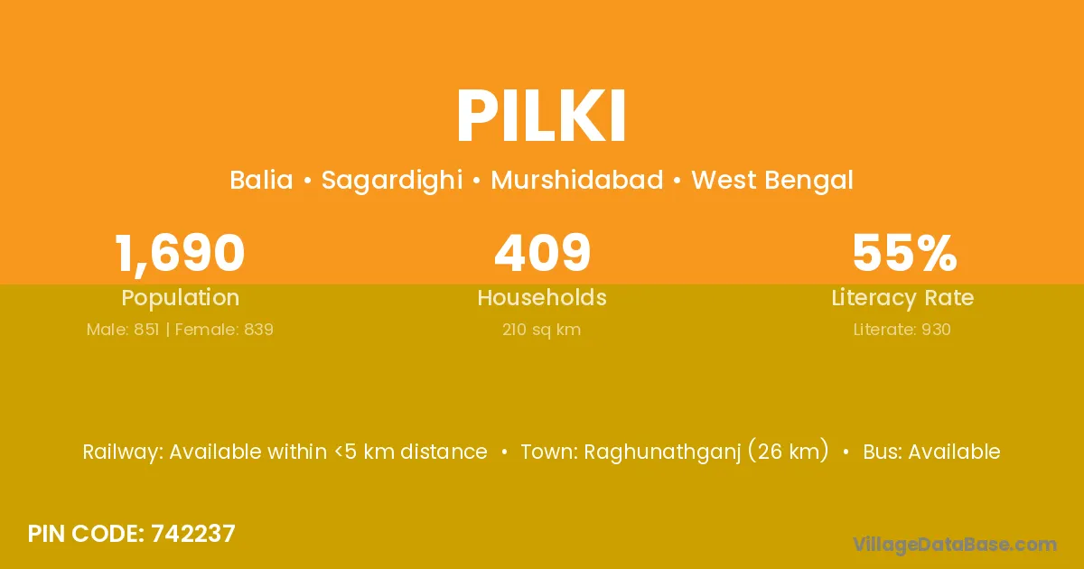 Raghunathganj (26 km) is the nearest town to Pilki village for major economic activities and is located approximately 26 km away.