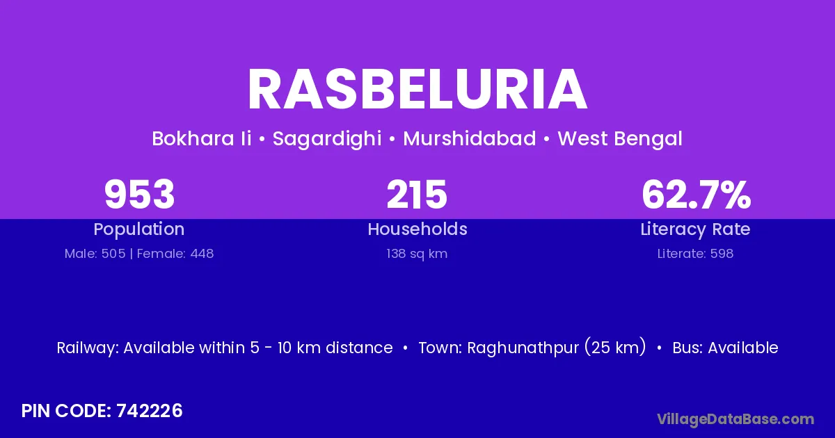 Raghunathpur (25 km) is the nearest town to Rasbeluria village for major economic activities and is located approximately 25 km away.