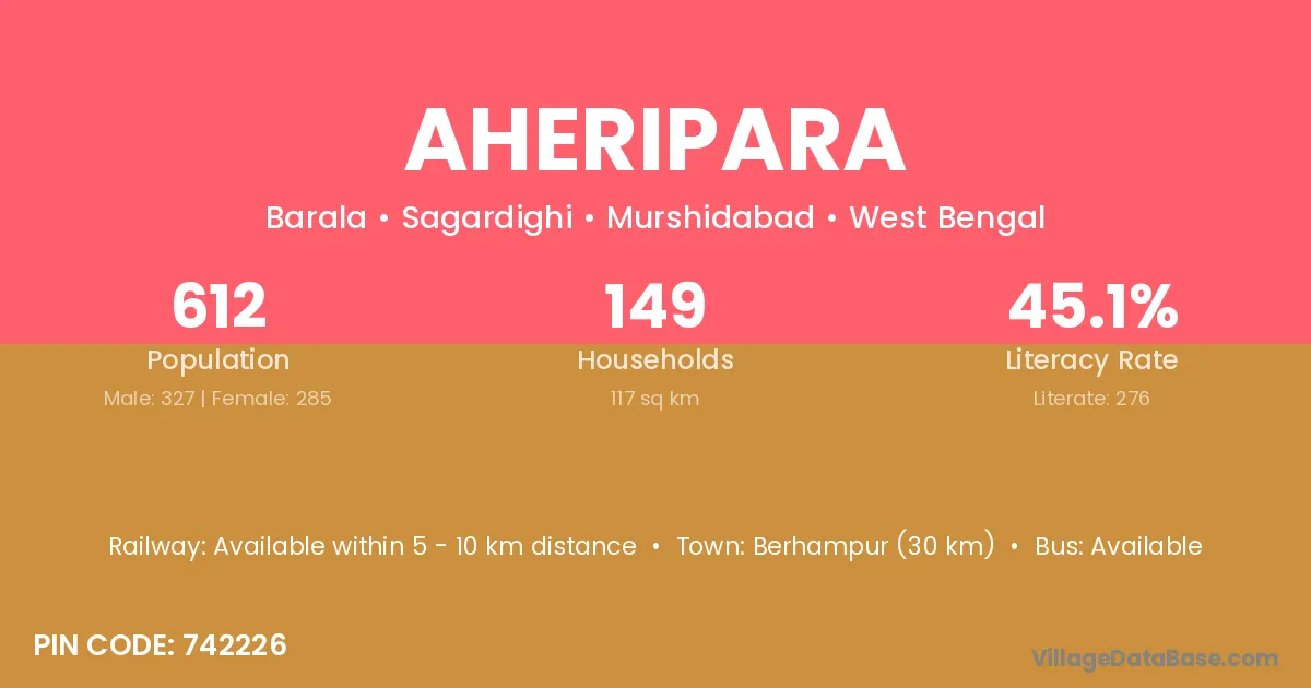 Berhampur (30 km) is the nearest town to Aheripara village for major economic activities and is located approximately 30 km away.