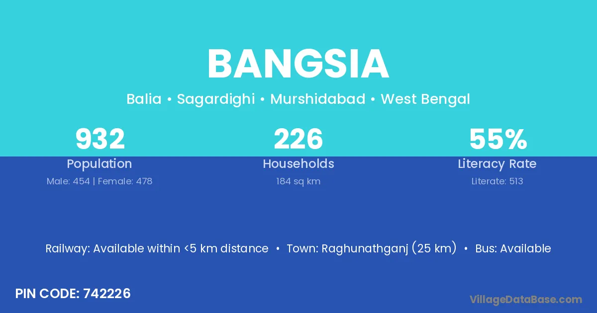 Raghunathganj (25 km) is the nearest town to Bangsia village for major economic activities and is located approximately 25 km away.