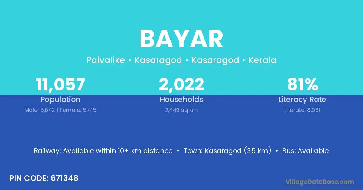 The literacy rate of Bayar village is 54.58%. Male literacy stands at 54.12% and female literacy at 55.05%.