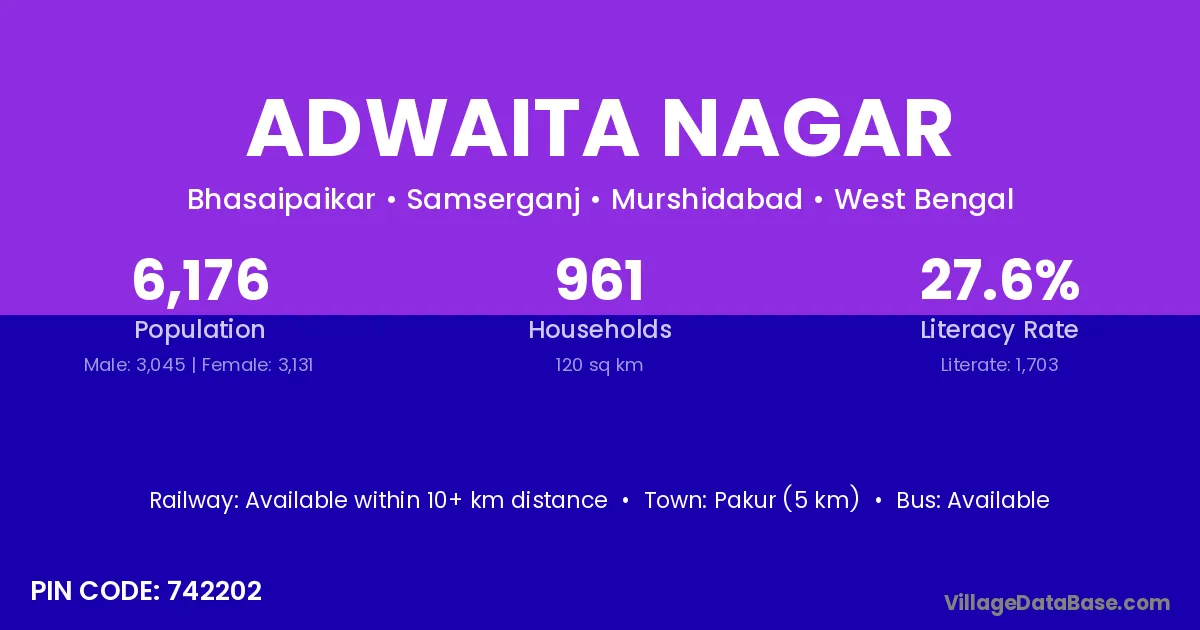 Adwaita Nagar village is located in the Samserganj Subdivision of the Murshidabad district in West Bengal.