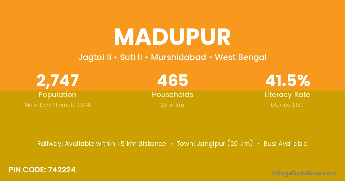 Jangipur (20 km) is the nearest town to Madupur village for major economic activities and is located approximately 20 km away.