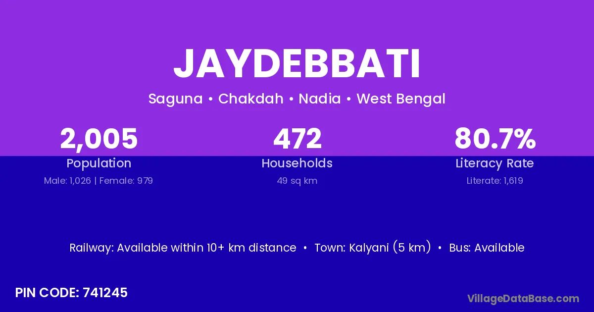 Kalyani (5 km) is the nearest town to Jaydebbati village for major economic activities and is located approximately 5 km away.